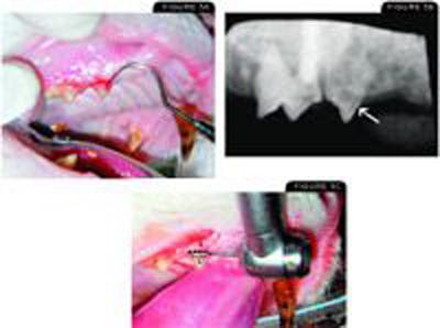 Se ha descrito un procedimiento de amputación de corona para extraer ciertos dientes que presentan FORL. En este procedimiento, se retira la corona del diente afectado con un FORL mientras se dejan atrás intencionalmente las raíces de reabsorción. Antes de realizar este procedimiento, hay que asegurarse de que no haya evidencia de enfermedad periodontal concurrente. Los gatos con periodontitis o estomatitis asociadas no son candidatos para la amputación de la corona. La radiografía dental es esencial para un diagnóstico y una planificación del tratamiento precisos.El tercer premolar superior derecho muestra evidencia de un FORL en el examen oral . La radiografía dental muestra (flecha blanca) con reabsorción radicular extensa. Este diente es un buen candidato para la amputación de la corona. . Se ha levantado un colgajo mucogingival exponiendo el hueso cortical bucal que recubre las raíces reabsorbentes. La corona será amputada a lo largo de la línea punteada negra, dejando intencionalmente lo que queda de las raíces. A continuación, se vuelve a colocar el colgajo con sutura fina absorbible.