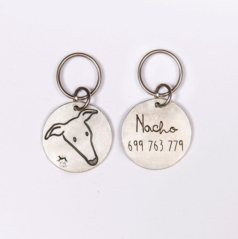 Con estas plaquitas lucirás por un lado un diseño de El galgo azul con la carita de uno de sus dos galgos: Nacho o Peter, y por el otro lado irá su nombre y tu teléfono para que, en caso de que se despiste, puedan localizarte rápidamente.