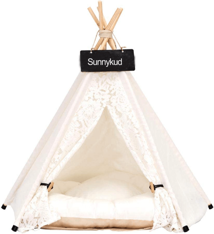 Esta casa tipi nos encandiló nada más verla. Su diseño minimalista dejando los postes de madera vistos es precioso. Si tu casa tiene un diseño nórdico y tonos naturales encajará perfectamente con tus muebles.Los tejidos utilizados tanto en la lona como en el cojín son lavables en la lavadora. Eso sí, a baja temperatura. Esto es un puntazo para mantenerla siempre libre de bacterias y olores, y que nuestra mascota duerma en un lugar saludable.