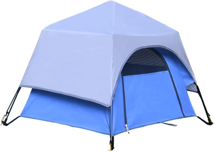 Su estructura es idéntica a la de una tienda de campaña convencional con sus postes cruzados de extremo a extremo sujetando la cubierta. Aguantará perfectamente lo que le echen. Viento, lluvia, juegos… Espera que no tengas que irte a resguardar con tu perro en una noche de tormenta porque tu tienda se ha desmontado .