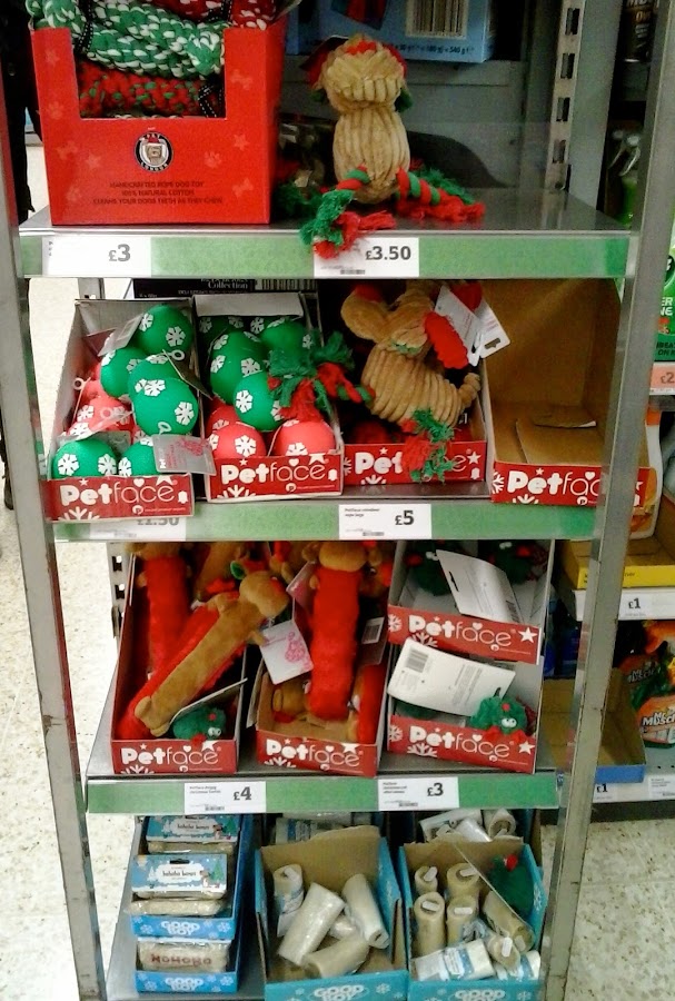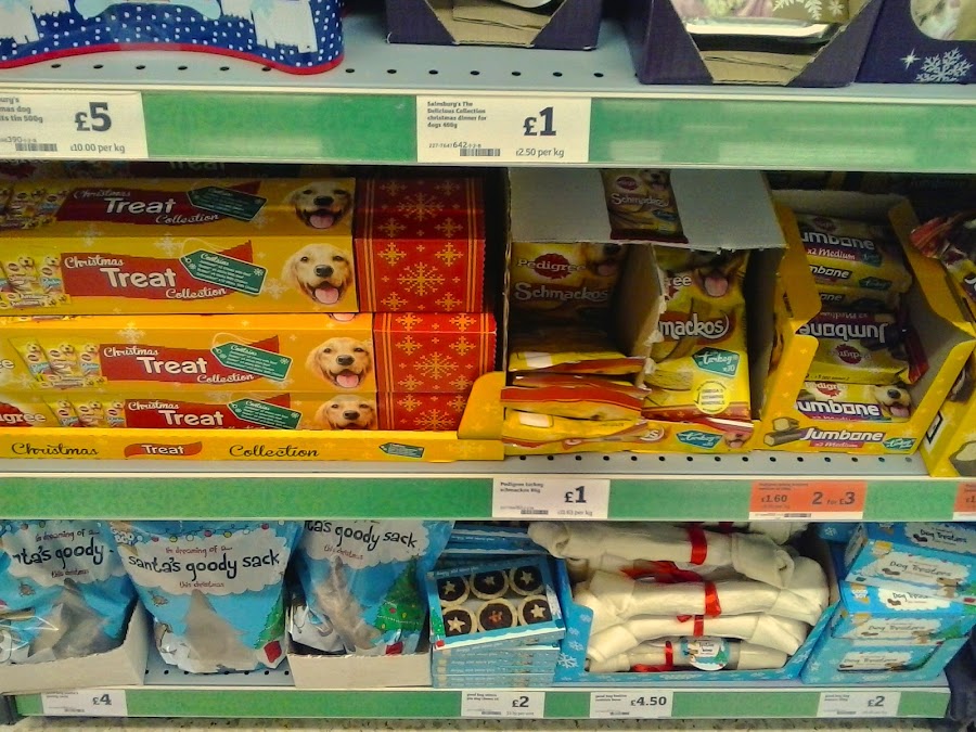 Aquí, en el imperio británico nadie se queda sin regalo, hasta las mascotas de la casa tienen sus propios pasillos en los supermercados con regalos de navidad.