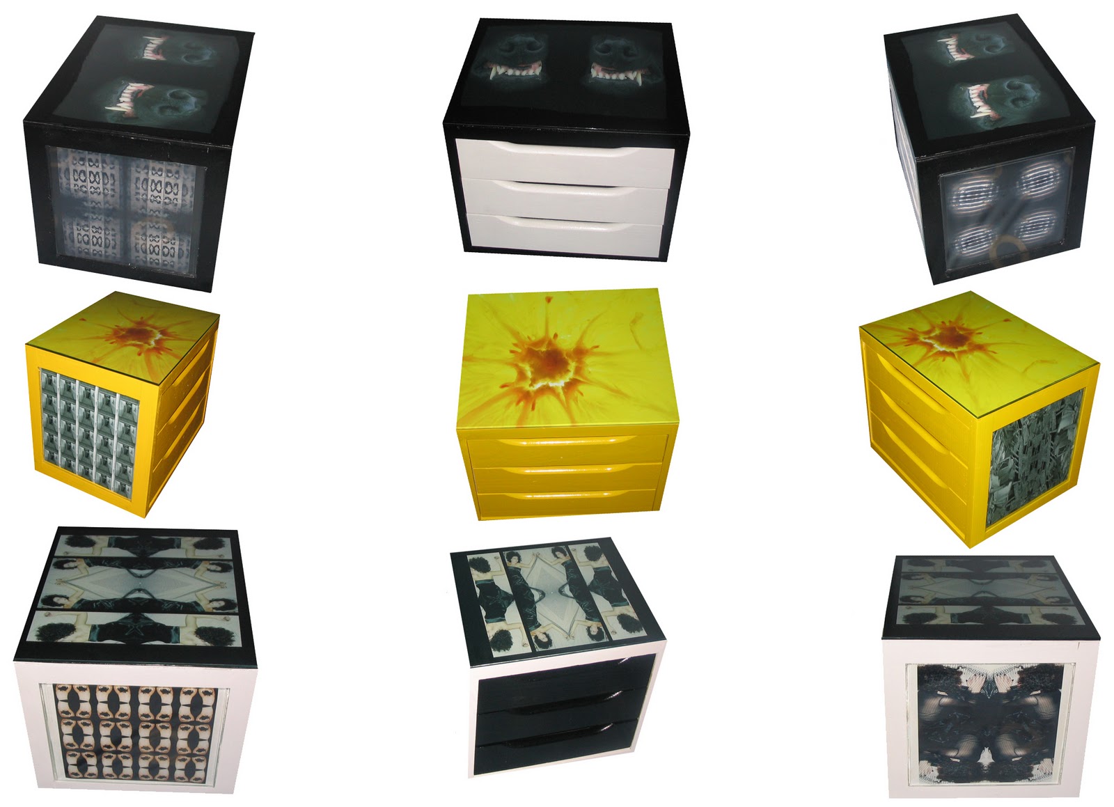 Compraba las cajoneras en Akí. Las pintaba del color deseado y les colocaba fotos mías ( junto a la decoración otra de mis pasiones) . La primera son los dientes de mi perro. La musa de la mesilla blanca es mi novia ... ( ya no soy el único que duerme todas las noches con ella )