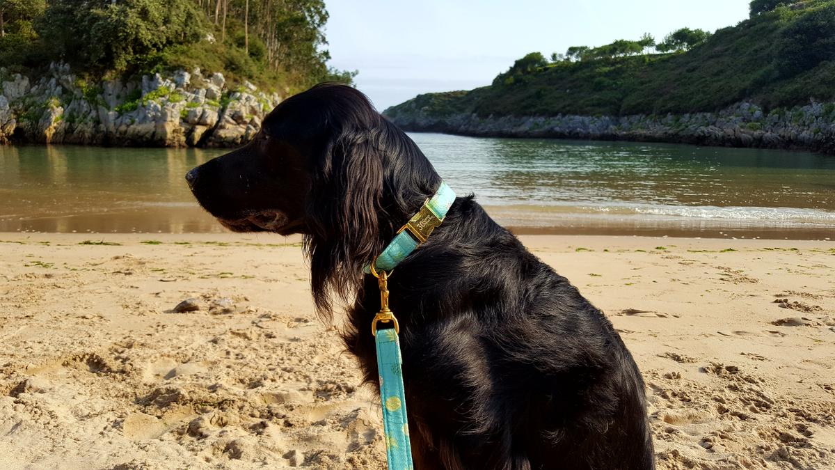 Nosotras escogimos este modelo de piñas en turquesa para darle un aire distinto a Amy que siempre va de rojo. Queríamos algo más veraniego y refrescante. La verdad es que le queda genial. Además, para que fuese un poco más sofisticado escogimos el cierre en dorado, también podéis cogerlo en plateado o martingale. La correa a juego queda monísima y como decía antes, al llevar el nylon, tiene consistencia y no te da la sensación de ir sujetando a tu perro con una cuerda de tender la ropa o un lazo de perrito de juguete.