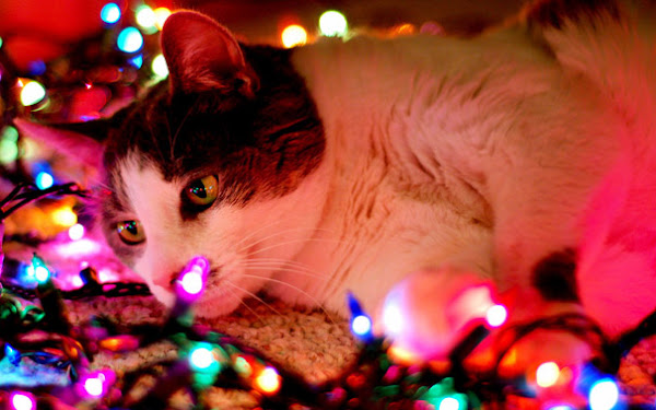 - Luces y mas luces: La electricidad y los cables son malos compañeros para los gatos. Nunca dejes solo al gato con las luces del arbol encendidas. Y procura que no muerda cables.