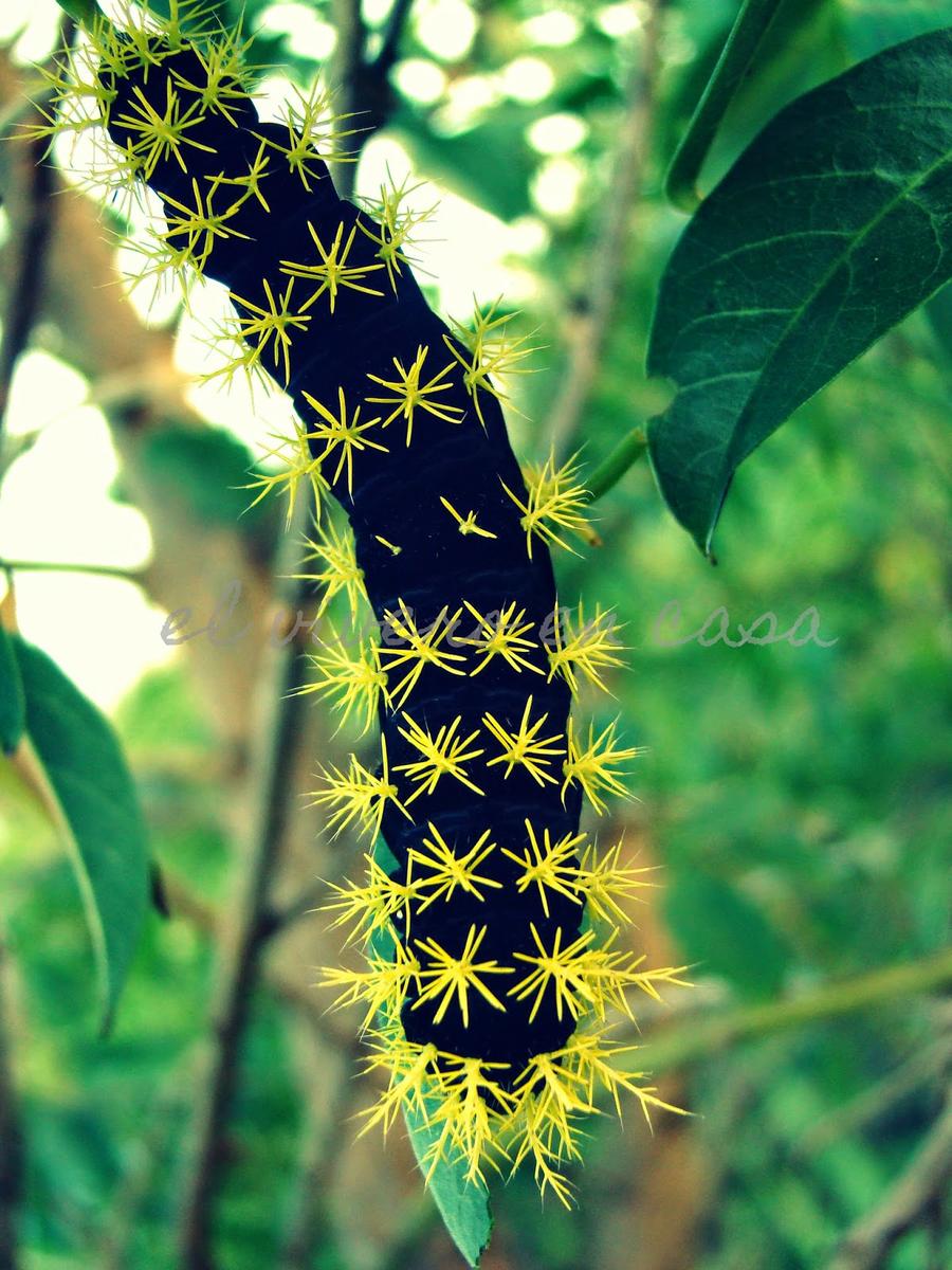 En la izquierda arriba, se ve como quedan las hojas del Ceibo en presencia de esta llamativa oruga!