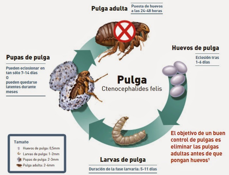 Si una mascota tiene pulgas es muy probable que una población mayor o menor de pulgas se haya instalado ya en la casa. Durante la temporada alta de pulgas en época caliente, el número de adultos, pupas, larvas y huevos muestra una típica forma de pirámide.