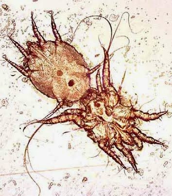 Los ácaros son arácnidos diminutos y los causantes de la sarna. Estos parásitos prefieren atacar a las zonas de la cabeza, cuello y orejas, y una primera sospecha de ácaros es que el animal sacude la cabeza por el picor. Conforme avanza la enfermedad, se producen costras y alopecia (pérdida de pelo). Existen distintos tipos de sarna: