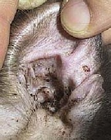 - Sarna otodectca: ocasionada por el Otodectes cynotis, altamente frecuente en gatos y representa el 50% de las otitis externas. Se puede producir dermatitis. Los otodectes producen otitis externa muy pruriginosa y contagiosa con la presencia de cerumen negruzco.