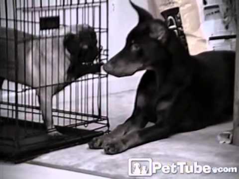 El perro pequeño se encuentra en una jaula, y lo que creo es que a su compañero no le parece una idea muy justa. Así que sin importarle quien lo esté mirando, se dispone a liberarlo. Después de varios intentos logra su cometido y pueden volver a jugar como siempre.