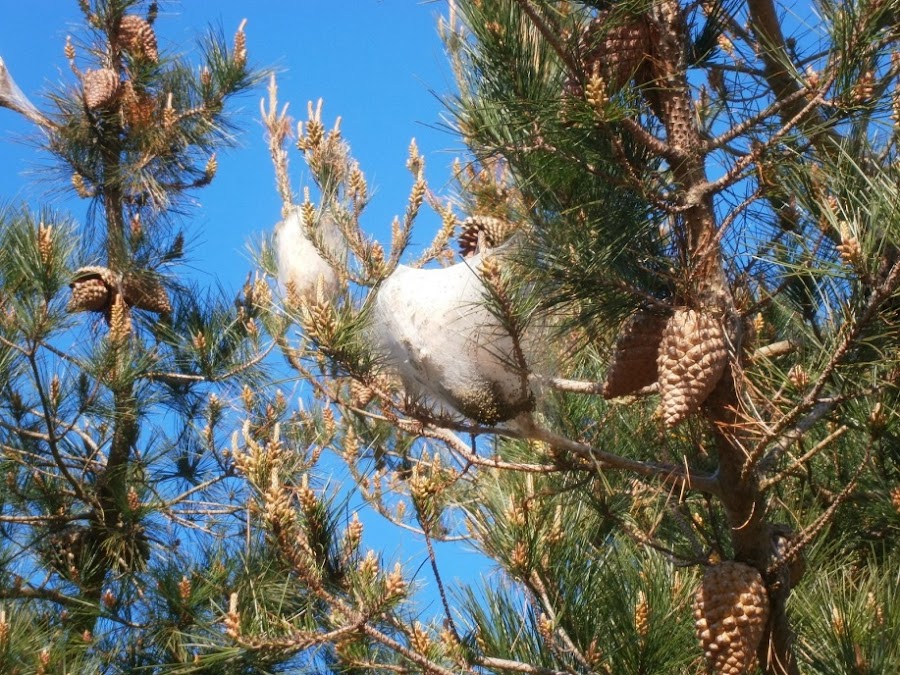 Poco a poco, van buscando el sitio ideal para hacer su nido o bolsón, es decir, las bolitas blancas y algodonosas que vemos en los pinos, que quedan pegadas por un capullo amarillo formado de los excrementos de las aproximadamente 200 orugas que se alojan.