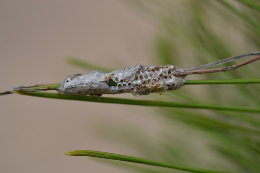 Al final del verano, los machos fecundan a las hembras y éstas depositan los huevos en forma de cápsulas en las agujas de los pinos. →