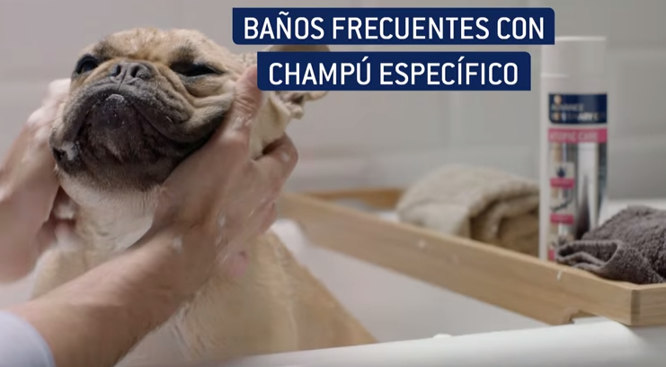 A la hora de realizar el baño, debemos utilizar un champú específico para nuestro perro, nunca uno de personas, ya que la composición de su piel es diferente. En clínicas veterinarias y tiendas de productos para mascotas podemos encontrar una multitud de productos diferentes pensados para cada raza de perro y tipo de pelo.