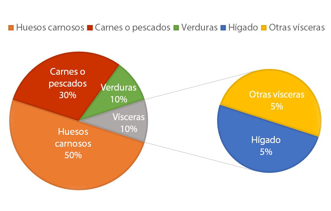 En este post pondremos un resumen de la cantidad de alimento que debe tomar un perro, gato o hurón según su edad, actividad, peso… y los porcentajes de cada alimento.