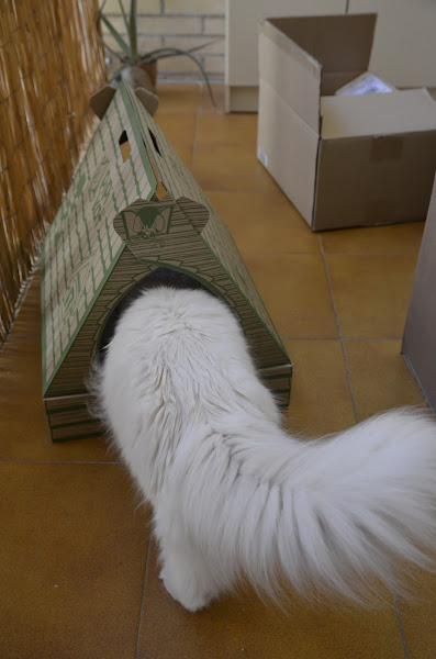 A los gatos, ademas, parece atraerles el hecho de que este hecho de carton...(ya sabeis lo que les gustan a los gatos las cajas). Aqui mi gata Beauty husmeando y entrando en ella...