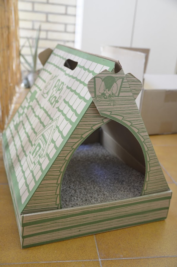 Aqui veis el arenero ya montado. Tiene dos aberturas, por delante y por detras, el gato puede acceder dentro por cualquiera.