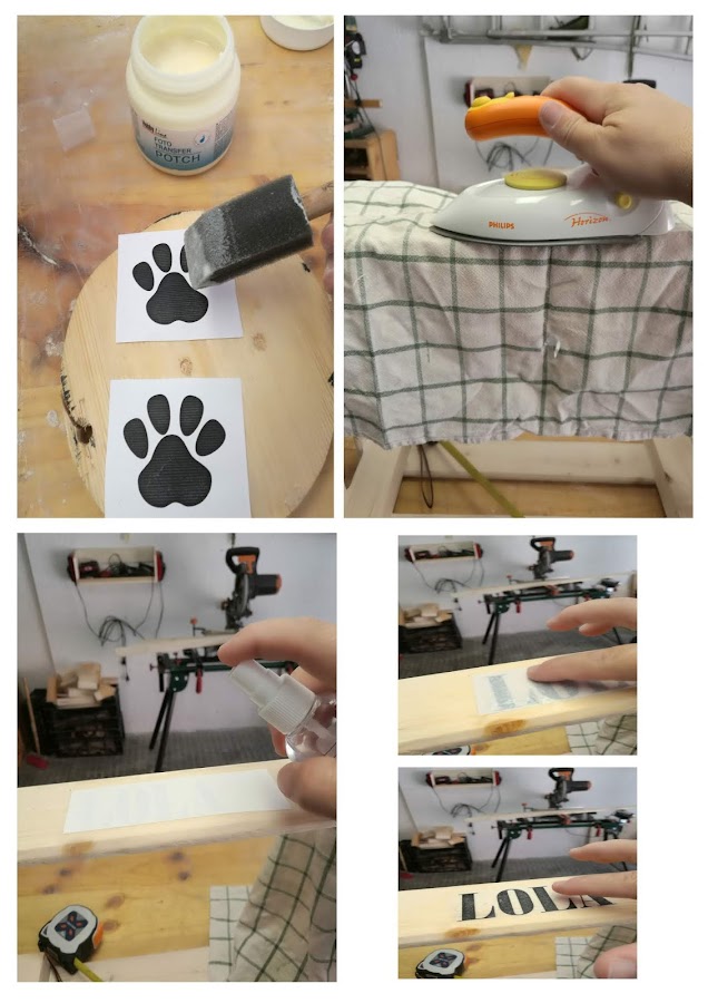 Llegaba el momento de transferir las imágenes a la madera. Yo particularmente, uso FOTO TRANSFER POTCH . Importante mencionar que las imagenes hay que imprimirlas en "modo espejo" y en impresora de láser. Una vez recortada la imagen, con una brocha de esponja, impregnamos con foto transfer la imagen por el lado de la imagen y también en la zona de la madera donde irá colocada. Generalmente habría que dejarlo 24 h hasta que se seque pero si quieres acelerar el proceso, colocando un trapo encima y con la plancha al máximo, le damos calor durante 1 min aproximadamente. Retiramos el trapo y con un bote de agua con difusor, le ponemos encima del papel. Con la yema del dedo vamos frotando en forma circular y muy suave (hasta que le cojes el truco, se estropean bastantes imágenes, así que toca empezar de nuevo) y asi poco a poco hasta conseguir que toda la tinta se quede grabada en la madera.