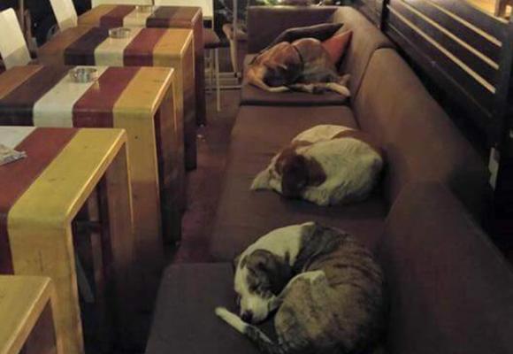 Por lo visto, cuando los clientes se van, por la noche, Hott Spott hace honor a su nombre y abre sus puertas a otros clientes distintos. Éstos no consumen nada pero son los más agradecidos del mundo: desde hace meses, los dueños del local invitan a los perros callejeros que hay en la zona para que puedan resguardarse del frío durante la noche.