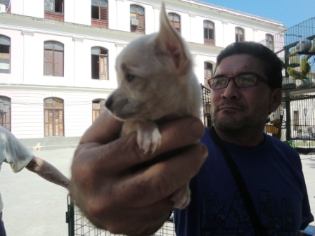 Este chihuahua cuesta 150 cuc. Alrededor de unos tres mil pesos cubanos y algo más, el salario tal vez de ocho meses de trabajo de cualquier individuo de a pie, a razón de 400 pesos mensuales como promedio. Como se lo estoy diciendo, este bebé de salud precaria e incierto futuro vale esa suma de dinero. Y yo me pregunto, nos estaremos volviendo locos los cubanos o es que la fiebre del oro ya nos nubló la razón? Cosas como esta están ocurriendo en cualquier esquina de La Habana, aunque las fotos las tomé en el Parque del Cristo en La Habana Vieja pero se imitan en otras plazas y barrios habaneros, donde se pueden ver tanto cachorros, hámster o pájaros exóticos, hacinados en jaulas de reducidos espacios, sin agua suficiente y muchas veces castigados por el sol.