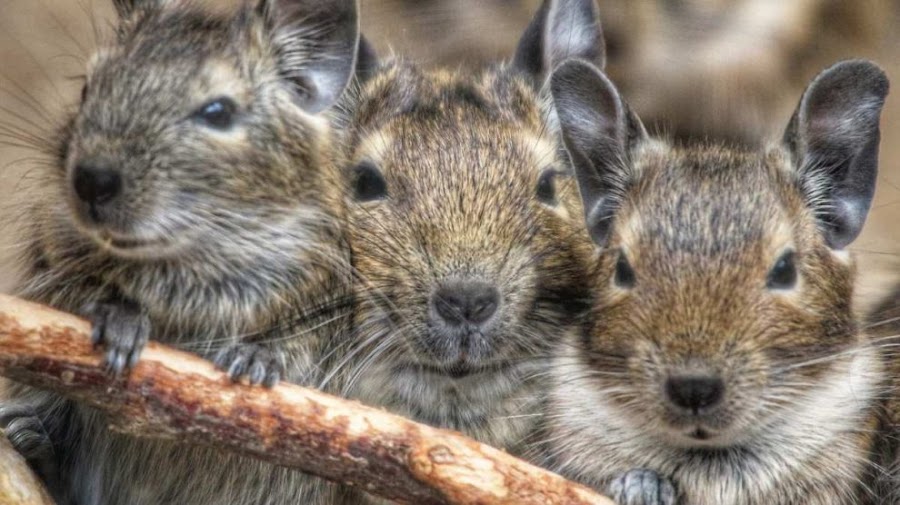 Si has pensado en tener un degú como mascota, sin duda es una excelente idea. Este pariente cercano de la chinchilla es un pequeño roedor suave, originario de Chile. Su aspecto físico es muy parecido al de un jerbo, pero de gran tamaño, con pelaje marrón, orejas redondeadas, piel fina y con una nariz de aspecto romana. Una diferencia entre estos animales está en el peso, ya que un jerbo tiene una masa corporal en estado adulto de 57g, mientras que el degú pesa entre 170 y 300 g. Los degús son criaturas extremadamente sociales, que viven en numerosas comunidades de hasta 100 ejemplares. Entre ellos se organizan para excavar amplias viviendas subterráneas, con docenas de túneles que conducen a diferentes compartimientos.