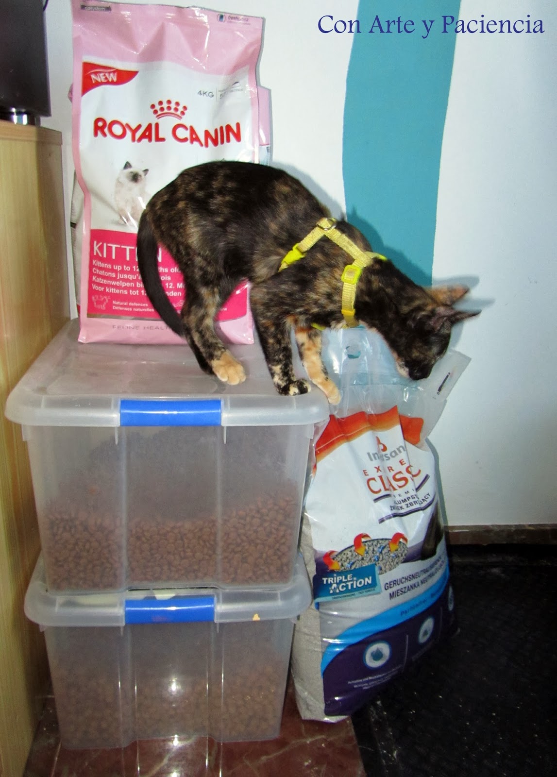 También hay lugar para almacenar la arena y el pienso de manera que ocupen poco espacio. Con estas cajas de plástico, además de ahorrar espacio evitamos los olores del pienso y conseguimos que el pienso esté en mejores condiciones. Eso sí, es conveniente que no le de la luz directa. En cada caja me cabe alrededor de 10 kg.