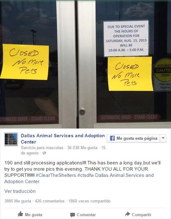 El refugio Dallas Animal Services, ubicado en el estado de Texas, fue participe de un evento extraordinario, en un solo día consiguieron que se adopten alrededor de 200 perros y gatos, todos los que tenían en el centro de adopción animal.El hecho ocurrió el 15 de agosto y se trató de una masiva campaña de adopción nacional en EE.UU. llamada “Clear The Shelters” (Despeja los refugios), un evento donde los centros de rescate animal dejan a un lado los estándares de adopción para que las mascotas puedan encontrar un hogar, pero se aseguraron que los dueños fuesen apropiados.