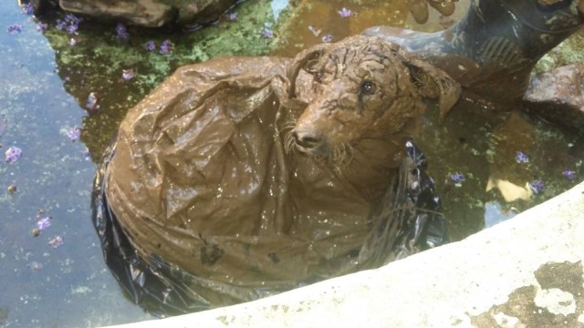 La perra fue encontrada muy sucia de barro en las márgenes de un río.